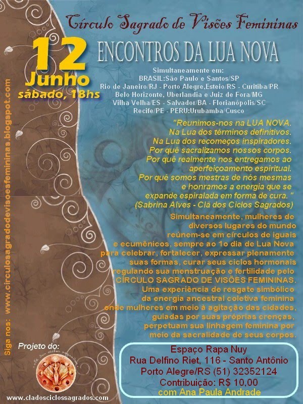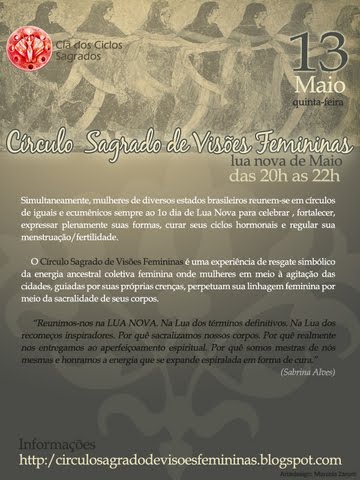 Simultaneamente, mulheres de diversos estados brasileiros e outros países, reúne-se em círculos de iguais e ecumênicos, sempre ao PRIMEIRO dia de Lua Nova para celebrar, fortalecer, expressar plenamente suas formas, curar seus ciclos hormonais e regular sua menstruação/fertilidade pelo Círculo Sagrado de Visões Femininas. Este trabalho apesar de inicialmente ter sido ancorado pelo projeto CLA DOS CICLOS SAGRADOS, sob à coordenação de Sabrina Alves em São Paulo , expande suas teias em forma de gratidão e comunhão à Grande Mãe orientando outras mulheres de forma gratuita de outros estados do Brasil e países de lingua espanhola e portuguesa a canalizarem esta energia pelo poder da união e da sincronicidade.