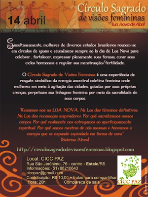 Quero também fazer um convite muito especial... Nesta primavera/2010 todas as Guardiãs dos Círculos Sagrados de Visões Femininas, de todos os Estados participantes desta REDErevolução, estarão se encontrando em São Paulo pela primeira vez. E este evento mágico será aberto ao público, participantes dos Círculos e família... venha, venha, não perca!